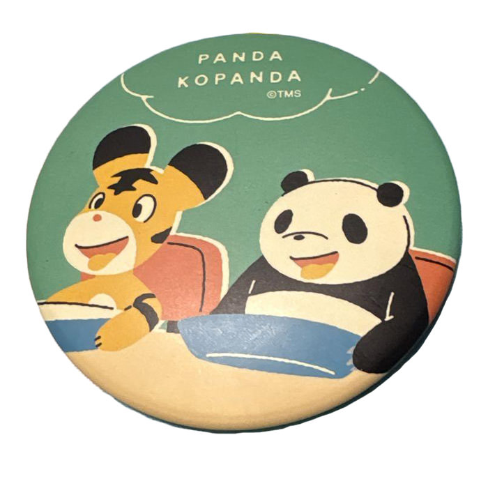 En knapp med motiv av karaktärer från animen Panda, Panda (en animé som Hayao Miyazaki och Isao Takahata gjorde 1972) på framsidan och säkerhetsnål på baksidan …